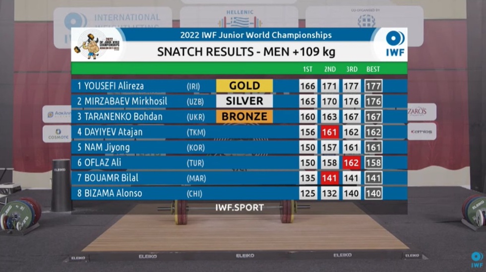 Бироқ, эронлик Али Ризо Юсуфий ҳамюртимиздан бир қадам олдинда юрди. У 166, 171 ва ниҳоят 177 кг оғирликни забт этди ва кичик олтин медални қўлга киритди.
