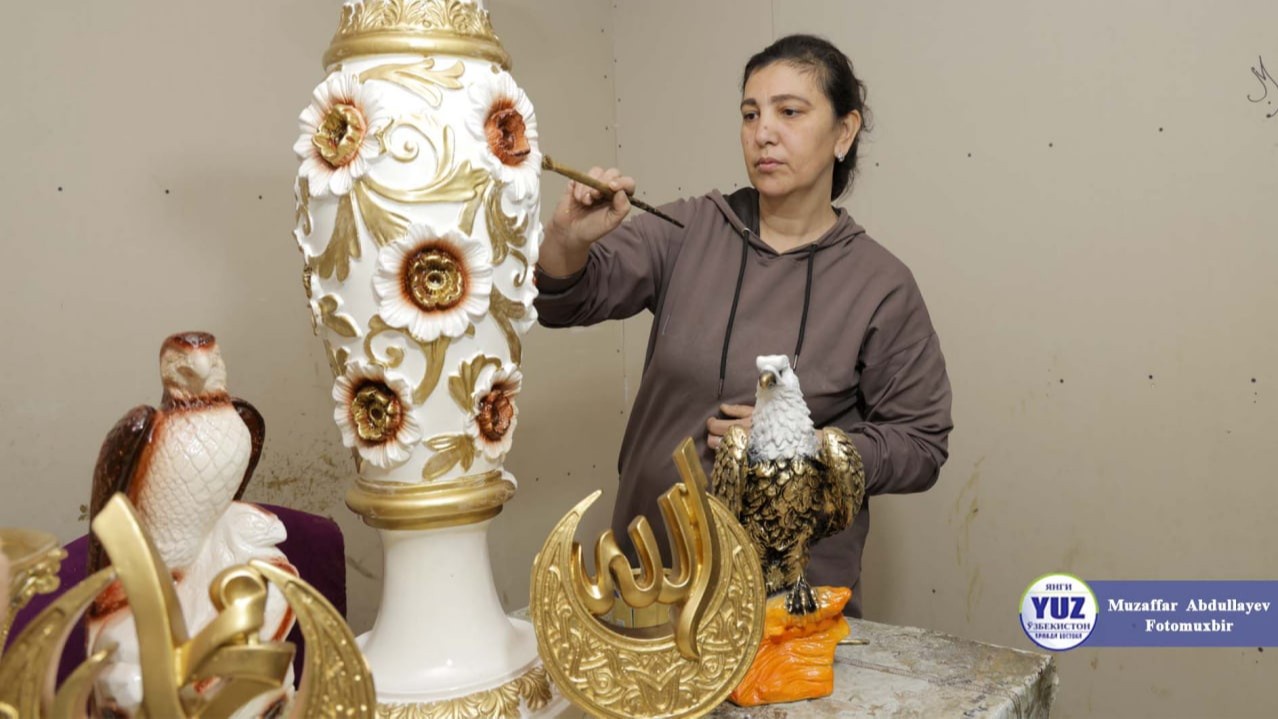 Хонадон цехидаги маҳсулотларни кўриб, кўзингиз қамашади. Гипсдан ясалган буюмлар бўяш ишларидан кейин янада жилоланади. Қизиғи, бозорларда кўриб, Хитойдан олиб келинади, деб ўйлайдиганим бу буюмлар ўзимизда, Ўрта Чирчиқ туманидаги ҳунармандлар маҳалласида ҳам тайёрланар экан.