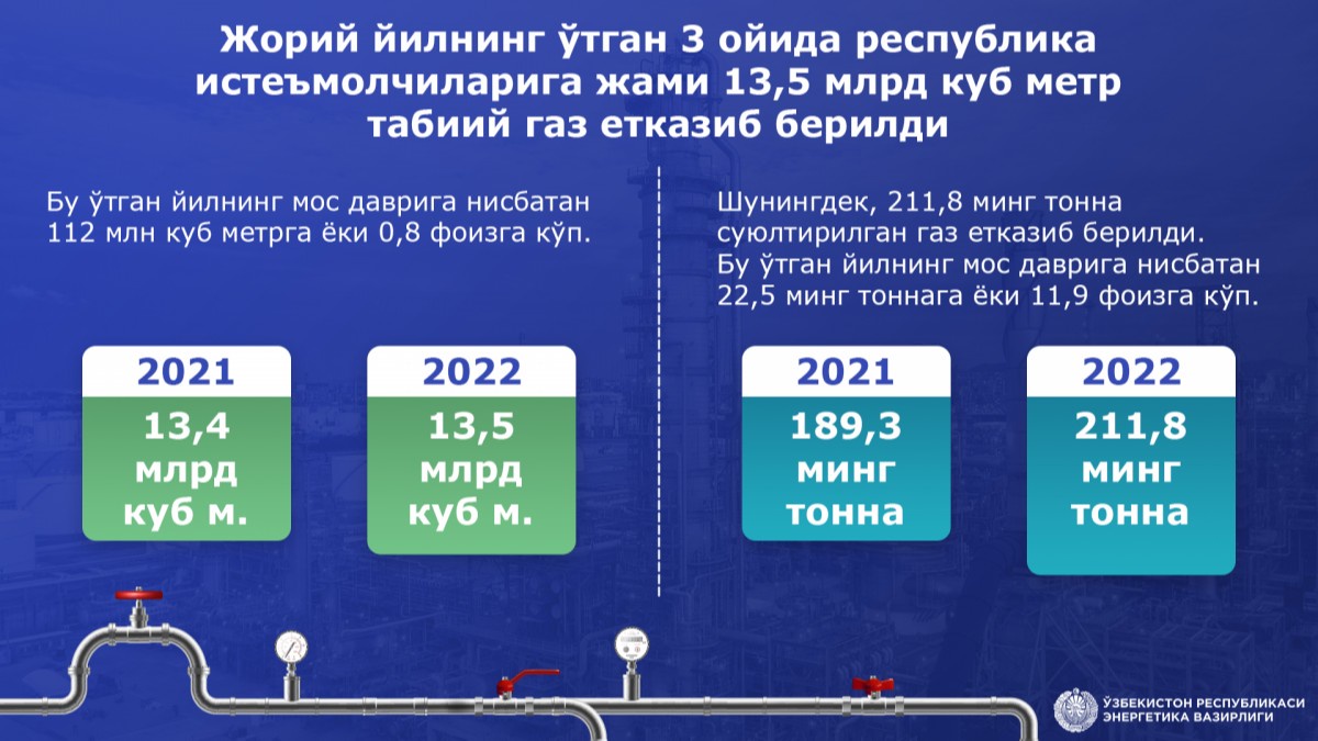 Шунингдек, 211,8 минг тонна суюлтирилган газ етказиб берилди. Бу ўтган йилнинг мос даврига нисбатан 22,5 минг тоннага ёки 11,9 фоизга кўп.
