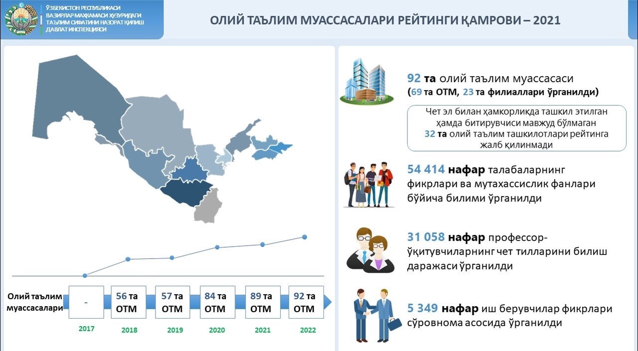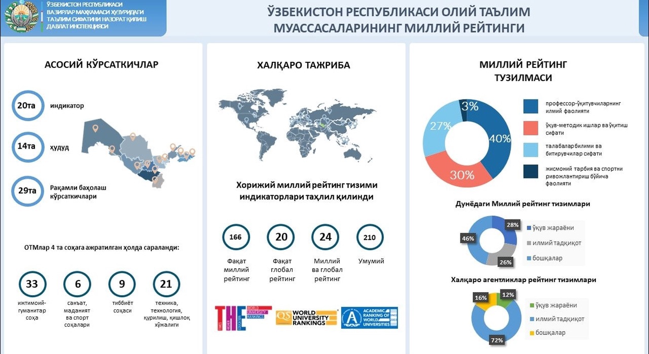 Таълим сифатини назорат қилиш давлат инспекцияси бошлиғи Улуғбек Тошкенбоевнинг маълум қилишича, миллий рейтинг доирасида битирувчилари мавжуд 92 та (шу жумладан, 69 та ОТМ, 23 та филиал) олий таълим муассасасининг фаолияти самарадорлигига қуйидаги 4 та йўналишдаги 20 та индикатор асосида баҳо берилди:
