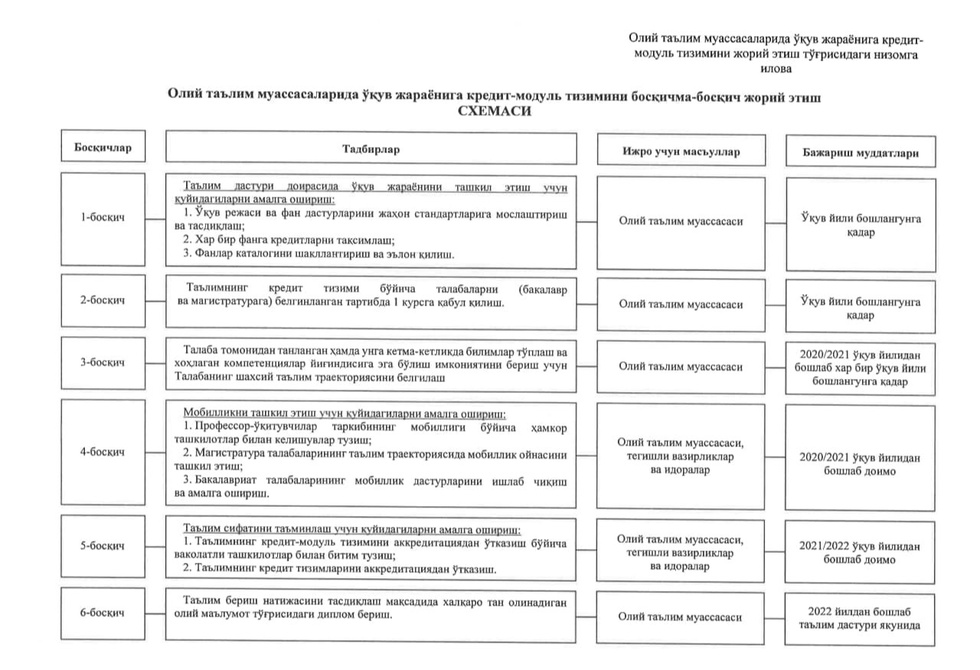 Шунингдек, қарор билан ОТМларда ўқув жараёнига кредит-модуль тизимини жорий этиш тартиби тўғрисида низом тасдиқланди ҳамда қуйидаги схема асосида босқичма-босқич жорий этилиши белгиланди.