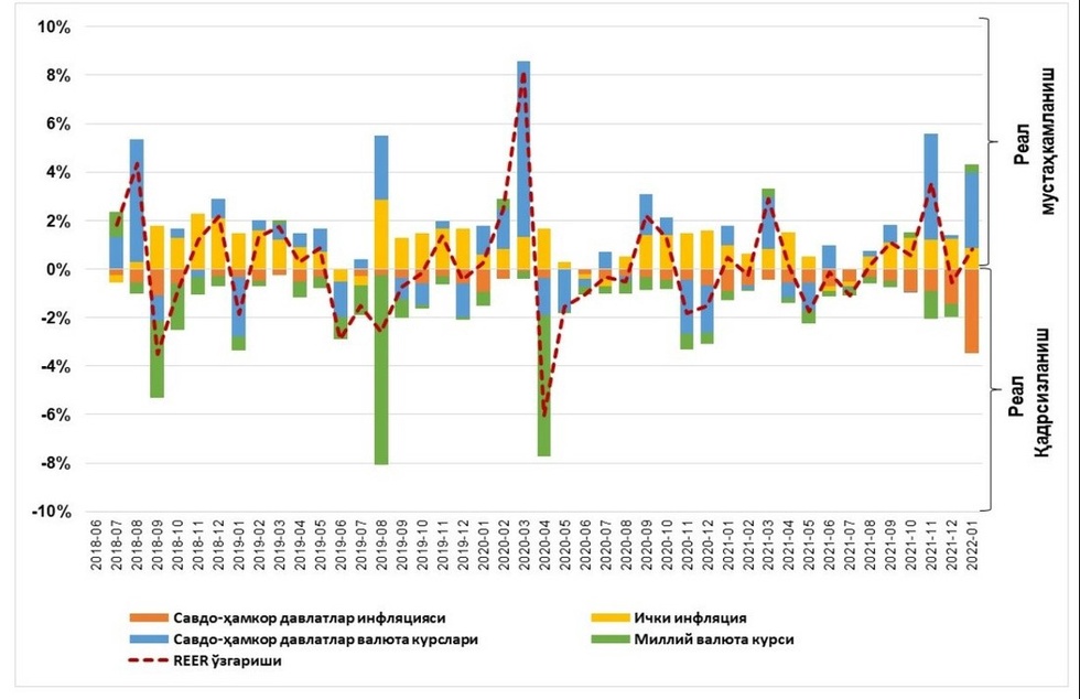 ▫️оширувчи омиллар: савдо-ҳамкор давлатлар валюта курслари ўзгариши – 3,1 фоиз банд, ички инфляция – 0,9 фоиз банд, сўм алмашув курси – 0,3 фоиз банд;