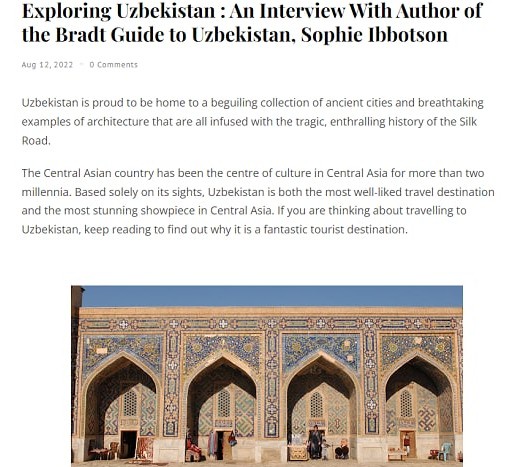 Софи Ибботсон ЮНEСКОнинг Жаҳон мероси объектлари бўлган ва қадимий тарих ҳамда муҳташам меъморий ёдгорликларга эга бўлган Самарқанд, Бухоро ва Хива шаҳарларини зиёрат қилишдан ташқари, Фарғона водийси билан танишишни ҳам тавсия этади. «Бу нафақат ҳунармандчилик, хусусан, сопол буюмлару ипак ишлаб чиқариши билан машҳур бўлган минтақа, балки Жанубий Осиёдан келган саёҳатчилар учун жуда қизиқарли манзил ҳамдир. Чунки айнан шу ерда Бобурийлар сулоласи пайдо бўлган. Бундан ташқари, археология мухлислари Сурхондарё вилоятининг Термиз шаҳри ва Қорақалпоғистонни ҳам ўз кўзлари билан кўришлари жуда қизиқарли кечади», дея таъкидлайди у.