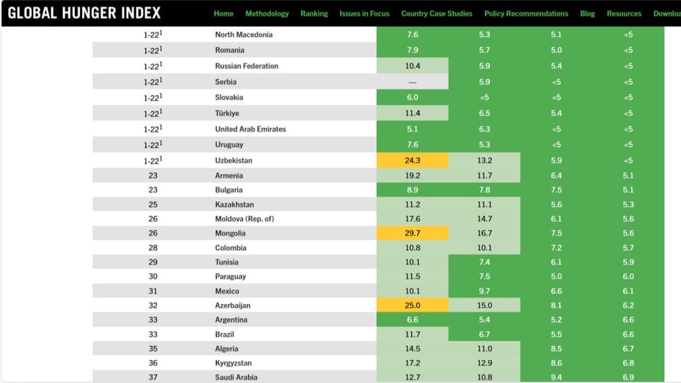 Жорий йилги рейтингда 127 та давлат иштирок этган. Рейтингда якуний балл қанчалик паст бўлса, мамлакатда тўйиб овқатланмайдиган фуқаролар сони шунчалик кам бўлади. Тадқиқот тўртта мезон: 5 ёшгача бўлган болаларнинг озиб кетиш ҳолатлари, бўйи ўсишдан тўхташи, ўлими ва аҳолининг тўйиб овқатланмаслиги инобатга олинади.