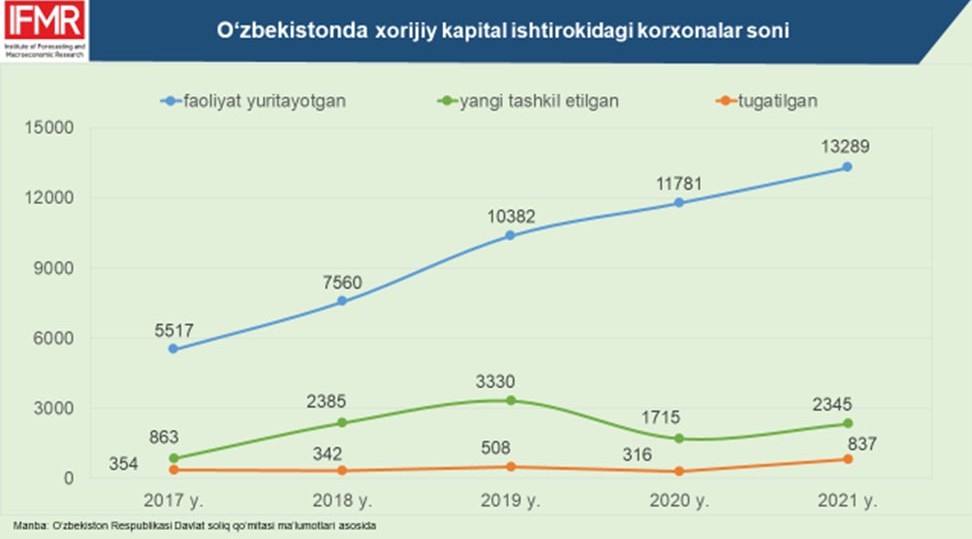 2017-2021 йиллар оралиғида хорижий инвестициялар иштирокидаги корхоналар сони 2,7 бараварга ошиб, 2022-йилнинг 1-январь ҳолатига кўра, 13,2 мингтага етган. Иқтисодиётимизга инвестиция киритаётган 50 дан ортиқ мамлакат орасида Хитой, Россия, Туркия, Қозоғистон ва Жанубий Корея етакчилик қилмоқда.