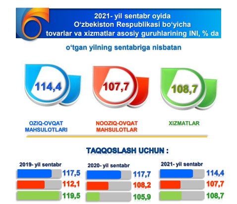 2021 йилнинг сентябрь ойида истеъмол бозоридаги товарлар ва хизматларнинг истеъмол нархлари индекси (ИНИ) 1,1 %ни ташкил этди. Жорий йил бошидан истеъмол секторида нархларнинг ўсиш даражаси 5,9 %, ўртача ойлик ўсиш даражаси эса 0,6 %ни кўрсатди. Йиллик нисбатда ИНИ ўсиш даражаси 10,8 %га етди, деб ёзмоқда review.uz сайти.