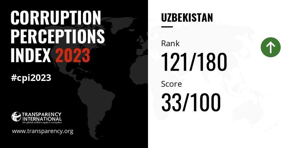 Ўзбекистон мазкур индексда сўнгги 7 йил давомида ўсиш суръатларини қайд этаётган (2017 йилда 22 балдан 2023 йилда 33 баллгача) давлат сифатида эътироф этилган.