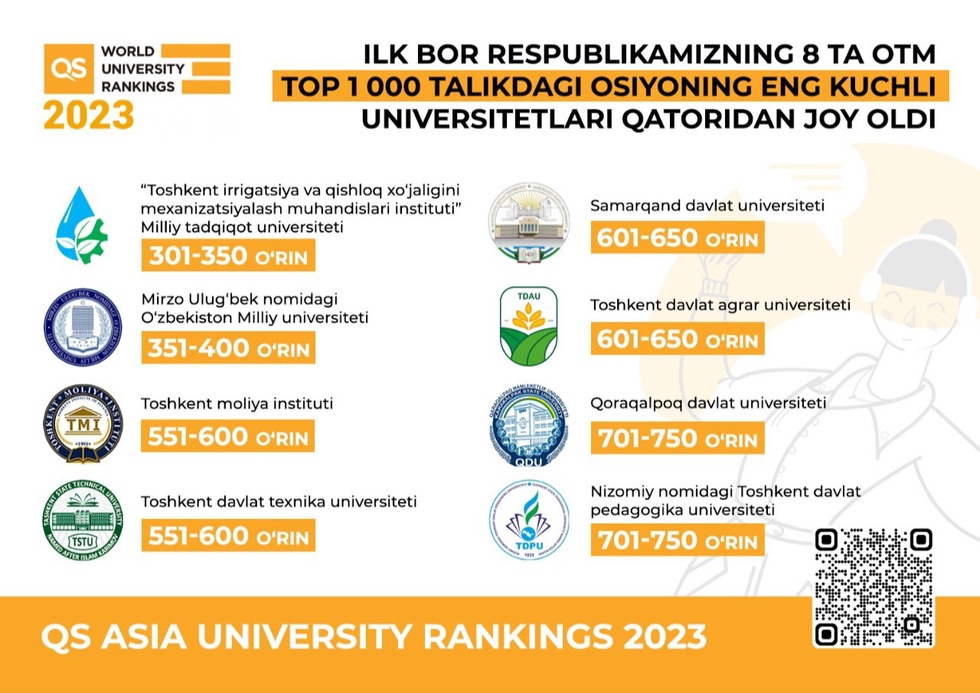 Қувонарлиси, қарорда белгиланган вазифалар ижроси доирасида қилинган ишлар самараси ўлароқ, ТИҚХММИ Миллий тадқиқот университети QS Asia University Rankings 2023да Осиё-Тинч океани минтақаси университетлари орасида 301-ўрин, Ўзбекистон олий таълим муассасалари орасида 1-ўринда қайд қилиниб, 40 фоизли энг илғор университетлар қаторидан жой олди. Ўзбекистон Миллий университети ҳам Осиё университетлари рейтингига кирди. Бу натижага эришилгани бежиз эмас. Давлатимиз раҳбарининг 2019 йил 8 октябрдаги “Ўзбекистон Республикаси олий таълим тизимини 2030 йилгача ривожлантириш концепциясини тасдиқлаш тўғрисида”ги фармонига мувофиқ, Ўзбекистон Миллий университети халқаро рейтинг агентликлари билан мунтазам алоқа ва ҳамкорликни йўлга қўйган. QS халқаро экспертлари томонидан таҳлил қилинганда олий таълим муассасасининг натижалари “Халқаро ҳамкорлик” рейтингида 141-ўриндалиги, бу университетнинг энг кучли жиҳати экани алоҳида қайд этилди. Шунингдек, академик салоҳияти бўйича 165, битирувчиларига иш берувчиларнинг нуфузига кўра 251+ ўринни эгаллаб, умумий рейтингда 351-ўрин билан энг илғор 500 университет қаторидан жой олди.