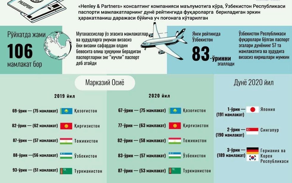 Рейтинг паспорт эгаси визасиз кириши мумкин бўлган мамлакатлар сони бўйича баҳоланади. Айни вақтда Ўзбекистон Республикаси фуқаролари бўлган паспорт эгалари дунёнинг 57 та мамлакатига ва ҳудудига визасиз киришлари мумкин. Деб хабар беради «Юксалиш» умуммиллий ҳаракати.
