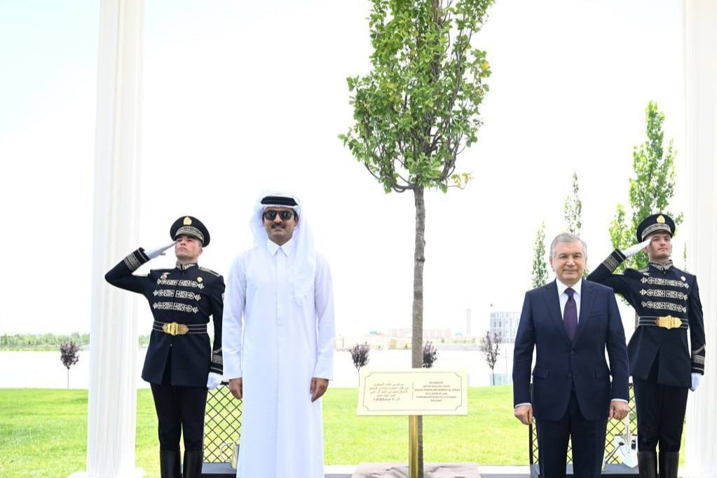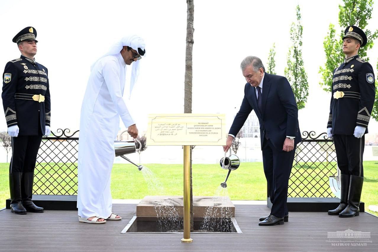 Ўзбекистон Республикаси Президенти Шавкат Мирзиёев ва Қатар Амири шайх Тамим бин Ҳамад Ол Соний Самарқанддаги Конгресс маркази боғида биргаликда дарахт экдилар.