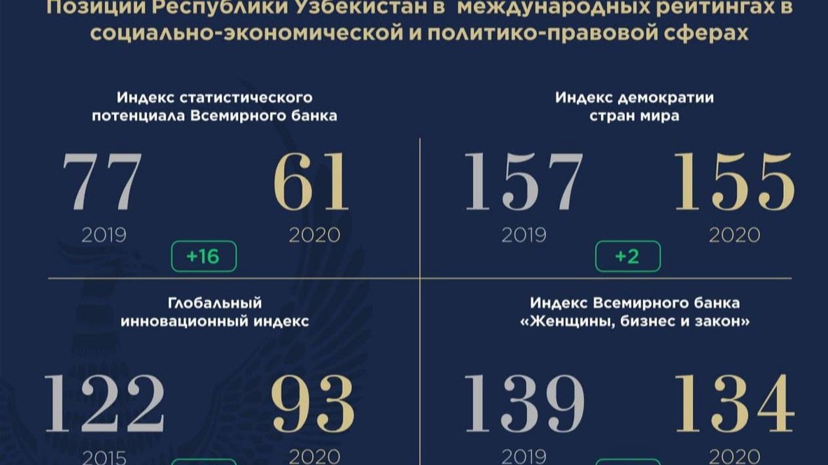 Хусусан, Жаҳон банкининг Статистик салоҳият индексида Ўзбекистон 2020 йилда 2019 йилга нисбатан 16 поғонага кўтарилиб, 146 та мамлакат орасида 61-ўринни эгаллаган бўлса, Жаҳон мамлакатлари демократияси индексида мамлакатимизнинг ўрни 2020 йилда 2 поғонага юқорилаб, 167 та мамлакат ичида 155-ўринни эгаллаган. Глобал инновацион индексда Ўзбекистон жами 100 баллдан 24,54 балл билан 2015 йилга нисбатан ўз ўрнини 29 поғонага яхшилаб, 131 та мамлакат орасида 93-ўринни, Марказий ва Жанубий Осиё давлатлари орасида эса