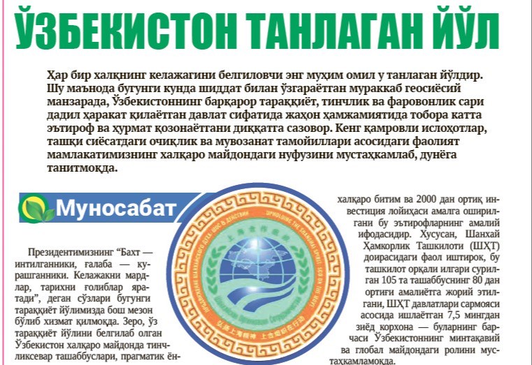 “ШҲТ университети”, илмий алмашинув марказлари, Конфуций институтлари фаолияти ёшлар учун кенг имкониятлар очмоқда. Ўзбекистон халқаро майдонда масъулиятли ҳамкор сифатида тобора тан олиняпти.