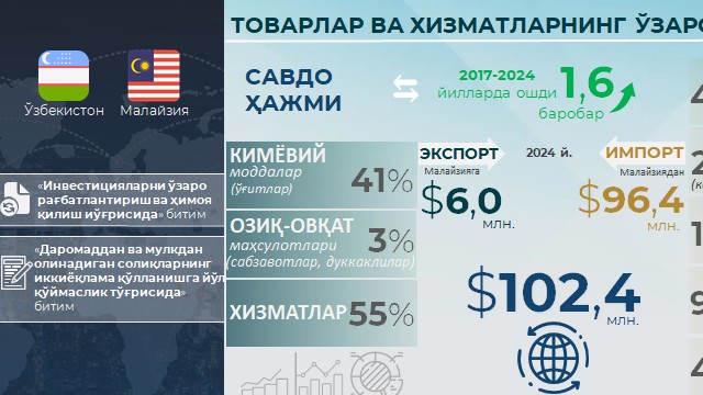 2017-2024 йиллар давомида Ўзбекистоннинг Малайзия билан товар айирбошлаш ҳажми 1,6 баробар 65,5 млн доллардан 102,4 млн долларгача ўсди, экспорт 1,3 баробарга, импорт 1,6 баробарга ошди. Бу рақамлар икки давлатнинг ўзаро савдони кенгайтиришга қизиқиши ортиб бораётганидан далолатдир.