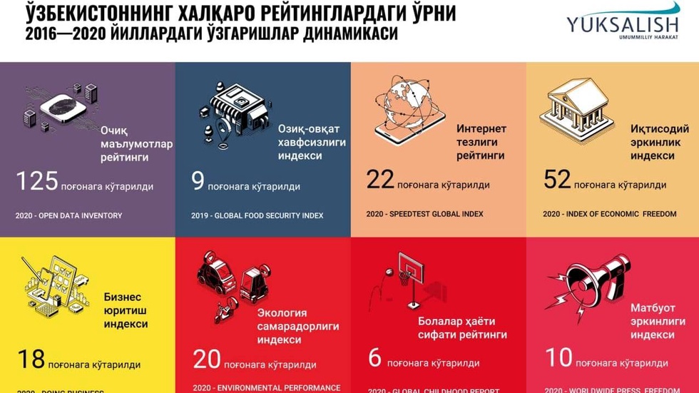 Жумладан, 2020 йилда Очиқ маълумотлар рейтингида Ўзбекистон бирданига 125 поғонага кўтарилди. Иқтисодий эркинлик индексидаги ўрни сезиларли равишда яхшиланди (52 поғона юқорилади). Киберхавфсизлик глобал индексида ҳам 41 поғонага кўтарилди.