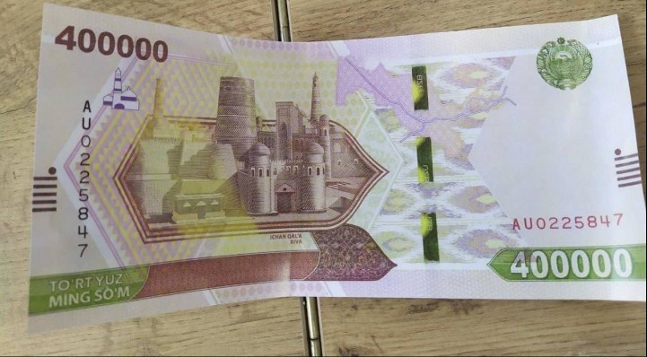 Қайд этилишича, ижтимоий тармоқларда тарқалиб, муҳокамаларга сабаб бўлаётган 400 минг сўмлик купюра ҳақидаги хабарлар ҳақиқатга тўғри келмайди. Ушбу суратда 100 минг сўмлик купюра дизайнини кўриш мумкин. Марказий банк ахборот хизмати раҳбари агар янги банкнота чиқарилса, расмий эълон қилинишини таъкидлади.