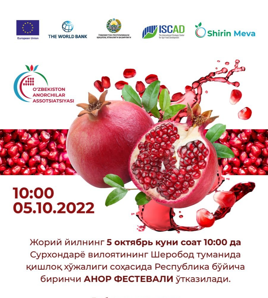 Тадбир Европа Иттифоқи комиссияси, Жаҳон банки, Ўзбекистон Республикаси Қишлоқ хўжалиги вазирлиги, вазирлик ҳузуридаги Озиқ-овқат ва қишлоқ хўжалиги соҳасида стратегик ривожланиш ва тадқиқотлар халқаро маркази, Сурхондарё вилояти хокимлиги, Ўзбекистон Анорчилар ассоциацияси, “Annexure Financial Solutions" консалтинг компанияси ва "ШиринМева” журнали ташкилотчилигида ўтказилади.