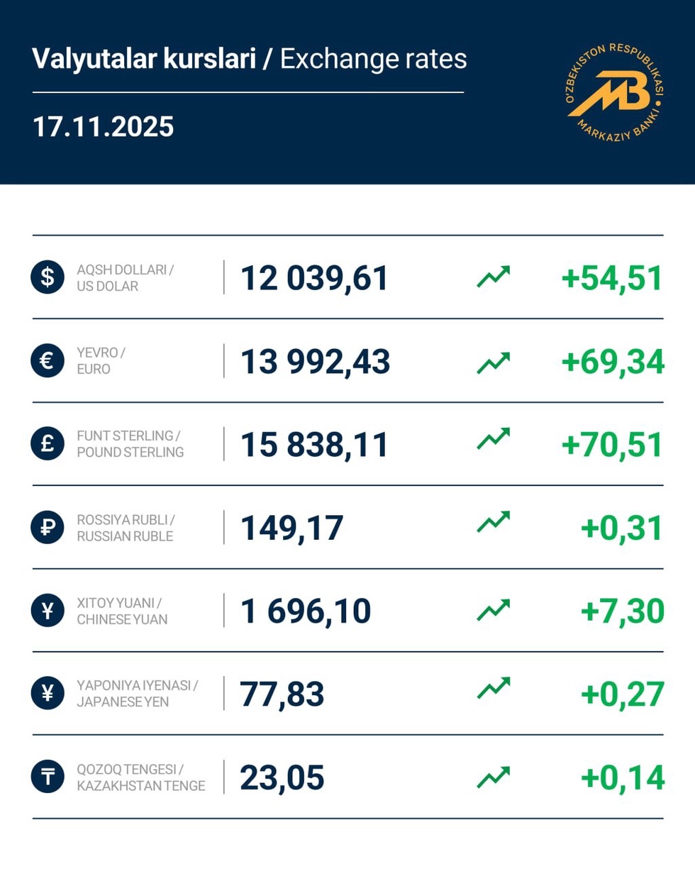 Марказий банкнинг 2025 йил 17 ноябрда эълон қилган расмий маълумотларига кўра, барча хорижий валюталар курси қуйидагича: