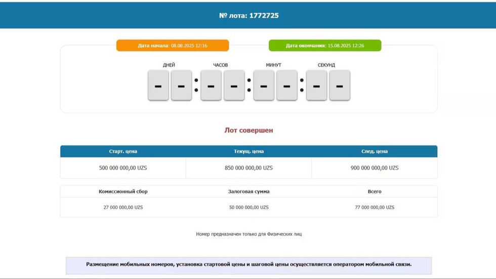 Орадан етти кун ўтиб, 15 август куни рақам 850 млн сўм эвазига сотилди. Республика товар-хомашё биржаси 7 та ноль рақамли телефон рақамини сотиш бўйича аукцион якунланганини маълум қилди.