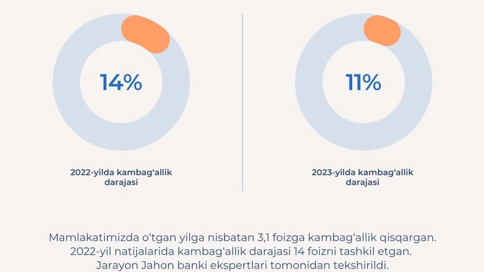 Мамлакатимизда ўтган йилга нисбатан 3,1 фоизга камбағаллик қисқарган. 2022 йил натижаларида камбағаллик даражаси 14 фоизни ташкил этган. Жараён Жаҳон банки экспертлари томонидан текширилди.