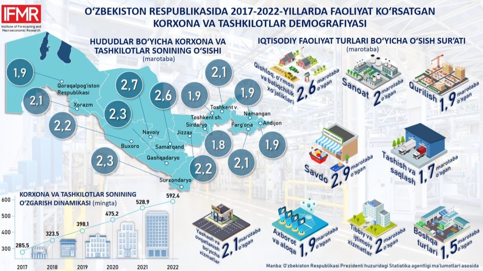 Статистика агентлиги маълумотларига кўра, 2022 йилда мамлакатимиздаги жами корхона ва ташкилотлар сони (фермер ва деҳқон хўжаликларисиз) 592,4 мингтани ташкил этган. Бу 2017 йилдагига нисбатан 2,1 маротаба кўп демакдир.