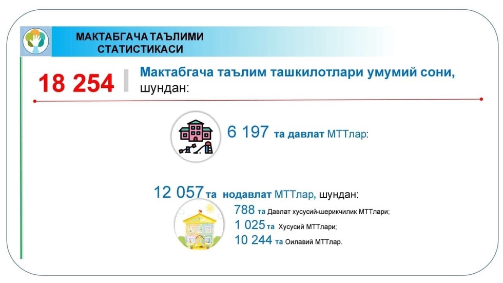 Маълумот ўрнида шуни айтиш жоизки, бугунги кунда республика миқиёсида 18 254 та мактабгача таълим ташкилотларида жами 1 699 566 нафар ёки 60,9% мактабгача таълим ёшдаги болалар тарбияланмоқда.