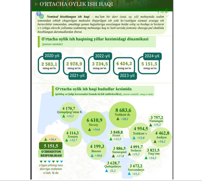 Дастлабки ҳисоб-китобларга кўра, жорий йил январь–сентябрь ойларида Ўзбекистонда ўртача ойлик номинал ҳисобланган иш ҳақи 5 миллион 151 минг сўмга етган. Бу кўрсаткич 2023 йилнинг мос даврида 4 миллион 424 минг сўм бўлган.
