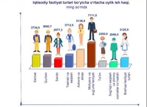 Қайд этилишича, ўртача ойлик иш ҳақининг энг юқори даражаси молиявий ва суғурта иқтисодий фаолиятида — 7 миллион 111 минг сўм ёки республика кўрсаткичидан (2 миллион 971 минг сўм) 2,4 баробар юқори эканлиги аниқланди.
