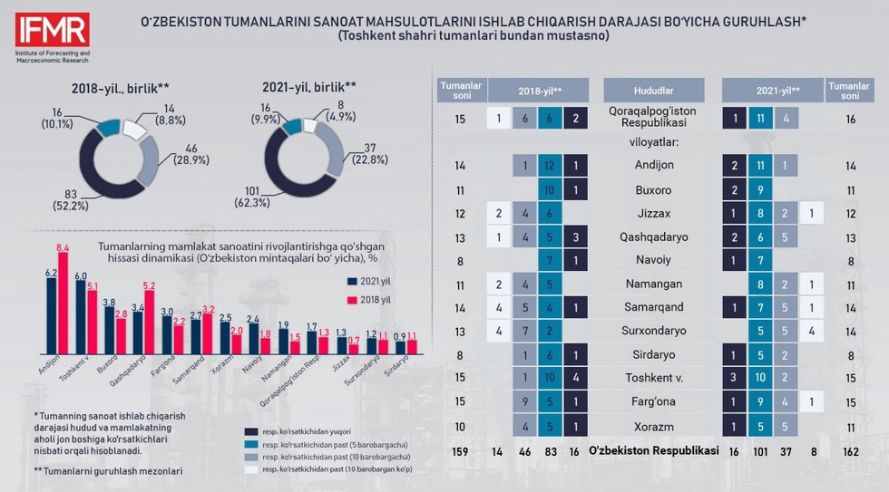 Умуман олганда, 2018-2021 йилларда саноатнинг ўртача ривожланиш даражасига эга бўлган туманлар сони 83 тадан 101 тага ортиб, ривожланиш даражаси пастлари 46 тадан 37 тага ҳамда қониқарсиз кўрсаткичларга эга бўлганлари сони 14 тадан 8 тага камайди. Бу ҳолатни маҳаллий салоҳият ва ресурслардан самарали фойдаланиш, қишлоқ жойларда тадбиркорлик ва инвестицион фаоллик ортишининг самараси сифатида изоҳлаш мумкин.