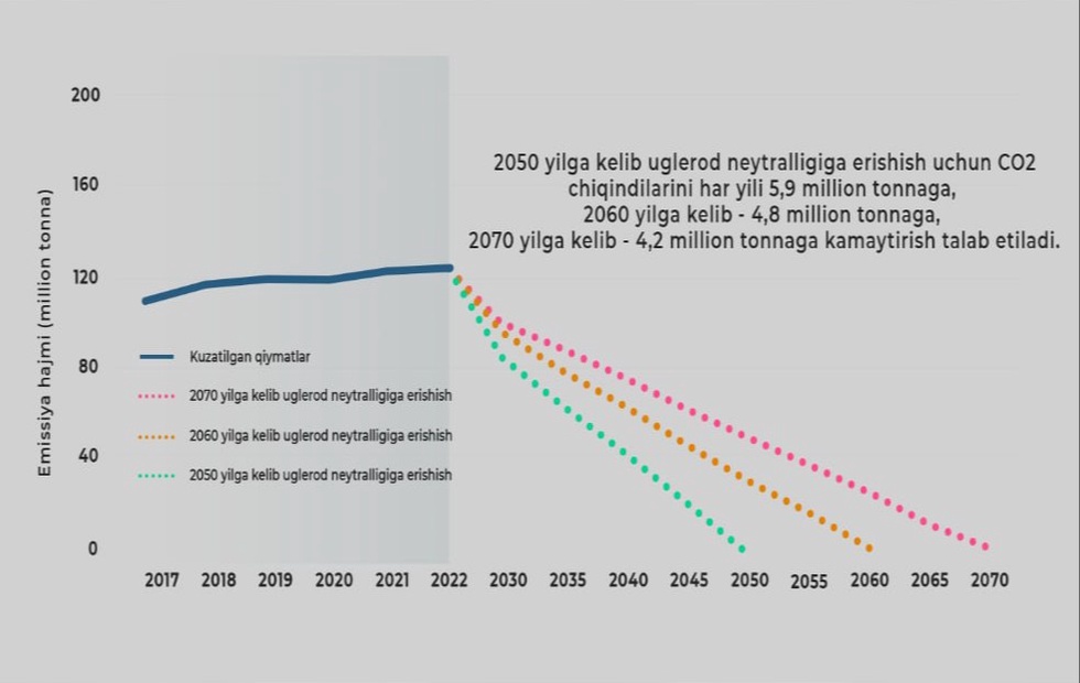 Макроиқтисодий ва ҳудудий тадқиқотлар институти экспертлари томонидан Ўзбекистонда CО2 эмиссияси баҳоланиб, ишлаб чиқилган сценарийларнинг ҳар бири CО2 эмиссиясининг турлича йиллик қисқаришини назарда тутади. Бунда вақт ўтиши билан ўзгарадиган омиллар ҳам ҳисобга олинган (муддат қанча узоқ давом этса, демографик ўсиш ва тегишли омилларнинг таъсири шунча катта бўлади).