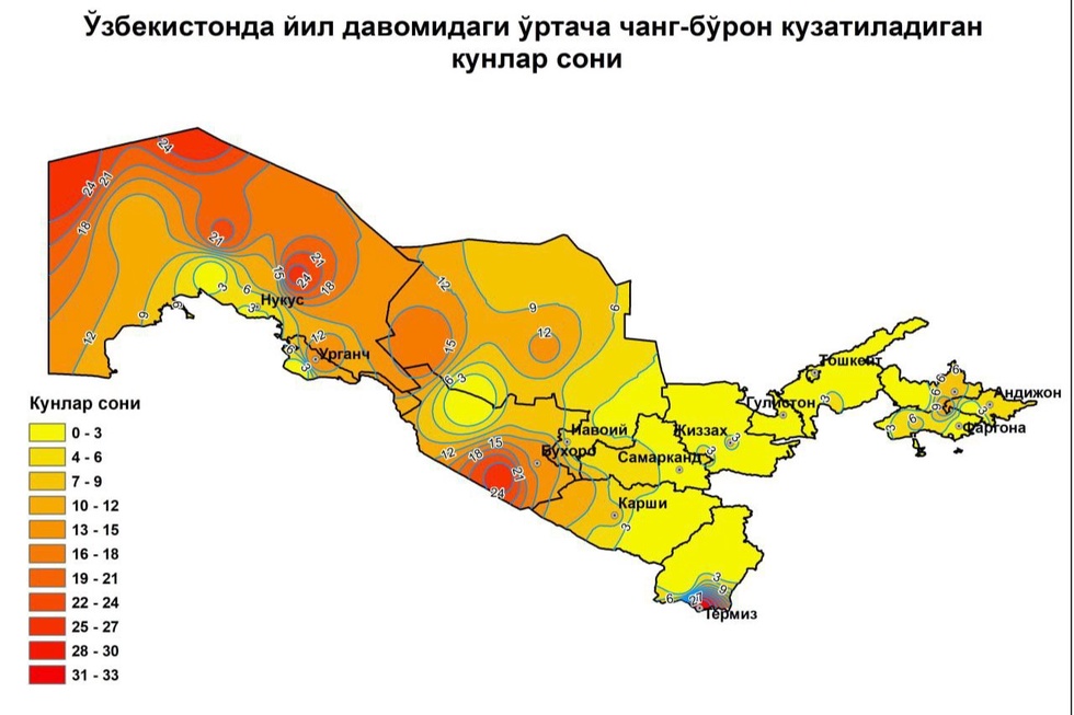 Мутахассиснинг таъкидлашича, республиканинг Сурхондарё вилояти жанубида йил давомида энг кўп чанг бўронлар кузатилиб, уларнинг ўртача сони 30 кундан кўп.
