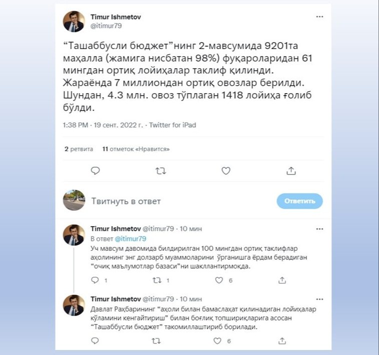 Унинг ёзишича, «Ташаббусли бюджет»нинг иккинчи мавсумида 9201 та маҳалла (жамига нисбатан 98%) фуқароларидан 61 мингдан ортиқ лойиҳалар таклиф қилинган. Жараёнда 7 миллиондан ортиқ овозлар берилган. Шундан, 4,3 миллион овоз тўплаган 1418 лойиҳа ғолиб бўлган.