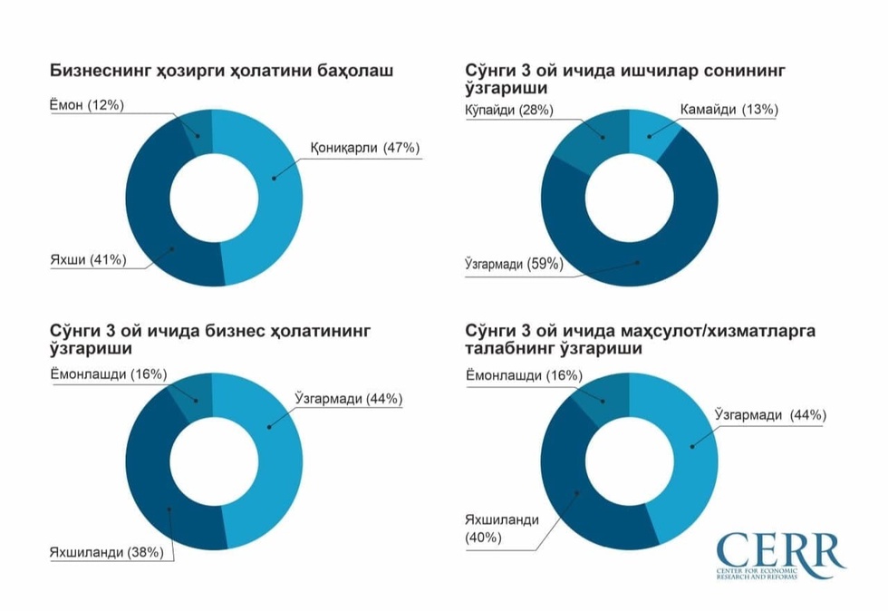 Иқтисодий тадқиқотлар ва ислоҳотлар маркази шу йилнинг март ойида келгуси уч ой ичида ўз бизнесини ривожлантириш истиқболларини қандай баҳолашини билиш учун республика бўйлаб мингга яқин корхоналар вакиллари билан суҳбат ўтказди.