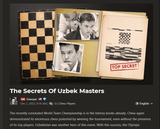 Мақолада яқинда Исроил давлатида бўлиб ўтган FIDE жамоавий жаҳон чемпионатида Ўзбекистон шахматчилари фахрли иккинчи ўринни эгаллагани қайд этилган. «Хитой шахмат бўйича ўзининг улкан салоҳиятини яна бир бор намойиш этди. Аммо Ўзбекистон бу воқеанинг яна бир қаҳрамони бўлди. Ушбу муваффақият билан Олимпиада чемпионлари жаҳон шахмат элитасидаги ўз ўрнини янада мустаҳкамлади».