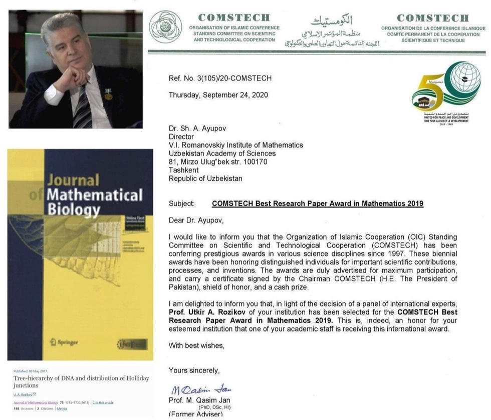 ИТҲҚ халқаро экспертлари ҳайъатининг 2020 йил 24 сентябрдаги қарорига биноан, 2019 йил учун математика соҳасида “Энг яхши илмий мақола” мукофоти, В.И.Романовский номидаги Математика институти илм-фан бўйича директор ўринбосари, профессор У.А.Розиковга [Rozikov U.A. Tree-hierarchy of DNA and distribution of Holliday junctions. Jour. Math. Biology, 2017. V.75, No.6, p.1715-1733] мақоласи учун берилди.