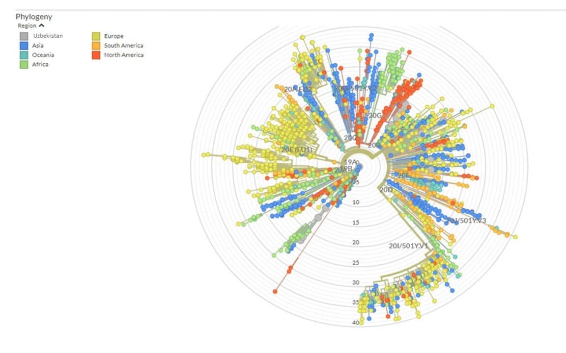 Шунингдек, олимлар қатор биоинформатик таҳлиллар ёрдамида (Nextclade) Ўзбекистонда тарқалган вирус вариантларини ҳозиргача ўқилган коронавирус маълумотлар базасидаги геномлар билан солиштирди. Натижада Ўзбекистондаги COVID-19 вариантларидан 18 тасининг шажарадаги ўрни аниқланди. Унга кўра, Ўзбекистонда учраётган COVID-19 вариантлари GR (20В) ва S (19В) гуруҳларига мансублиги аён бўлди. Шажаранинг GR (20В) тармоғида Ўзбекистон билан биргаликда, асосан, Европа, Осиё, Африка ва Австралия қитъаси вакиллари жойлашган бўлса, S (19В) гуруҳида эса Осиё ва Африкага хос вирус геномлари жойлашган. Бу факт ушбу иккита гуруҳ орқали мамлакатимизга кириб келган вируслар манбаи битта эмаслигини англатади.