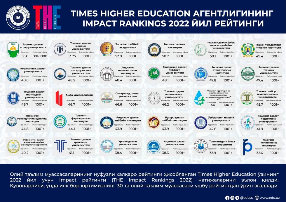 Маълумот учун, 2021 йилда ушбу рейтингга 10 та олий таълим муассасаси кирган эди. Ўтган йили ушбу рейтингда 94 та давлатдан 1000 га яқин олий таълим муассасалари иштирок этган бўлса, 2022 йилда 110 та давлатдан 1500 дан ортиқ олий таълим муассасалари қатнашди.