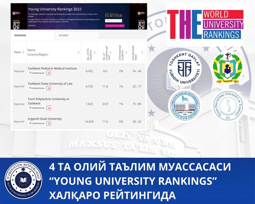 Маълумот ўрнида, “Young University Rankings” рейтинги дунёнинг 50 ва ундан кичик ёшдаги энг яхши университетлари рўйхатини тузади. Рўйхат “World University Rankings” флагмани билан бир хил 13 та мезон кўрсаткичларига асосланади.