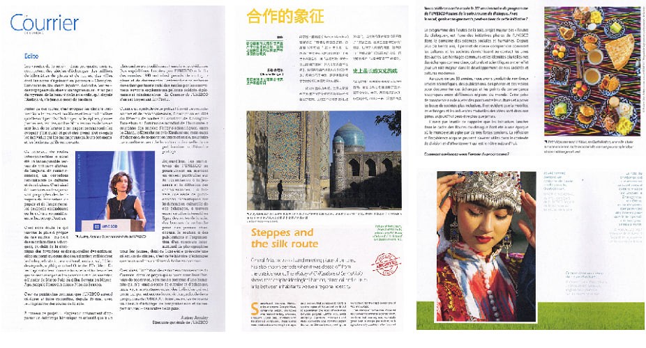 Жумладан, ЮНЕСКОнинг асосий нашрларидан бири, учта тилда чоп этилган (инглиз, француз ва хитой) «Курьер» журналидаги бир нечта мақолаларда Ўзбекистон билан боғлиқ кўҳна шаҳар ва буюк алломалар номлари келтириб ўтилган. ЮНЕСКО Бош директори Одри Азуле ўзининг муаллифлик мақоласида Самарқанд ва Бухоро шаҳарларини «Ипак йўлида жойлашган йирик савдо ва маданият марказлари» сифатида эътироф этган.
