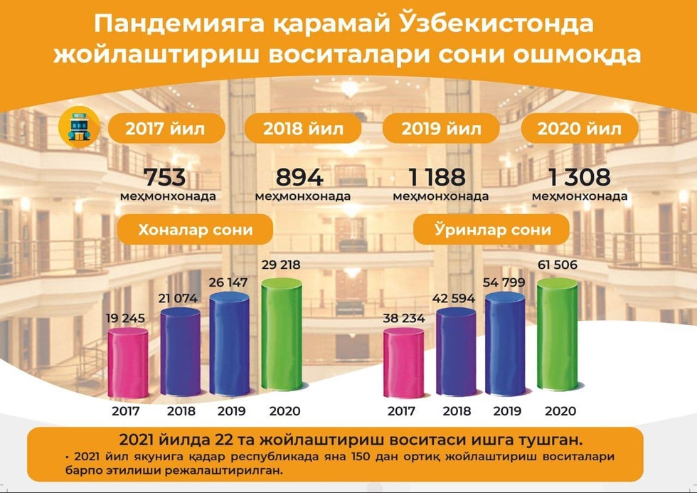 - 2020 йил охирида эса ушбу кўрсаткич 1 308 жойлаштириш воситасида 29 218 хонада 61 506 ўрин ташкил этилган.