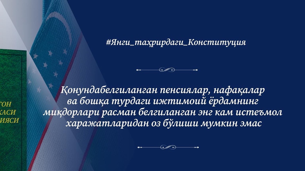 Янги таҳрирдаги Конституциянинг 46-моддасига асосан, “Қонунда белгиланган пенсиялар, нафақалар ва бошқа турдаги ижтимоий ёрдамнинг миқдорлари расман белгиланган энг кам истеъмол харажатларидан оз бўлиши мумкин эмас”.