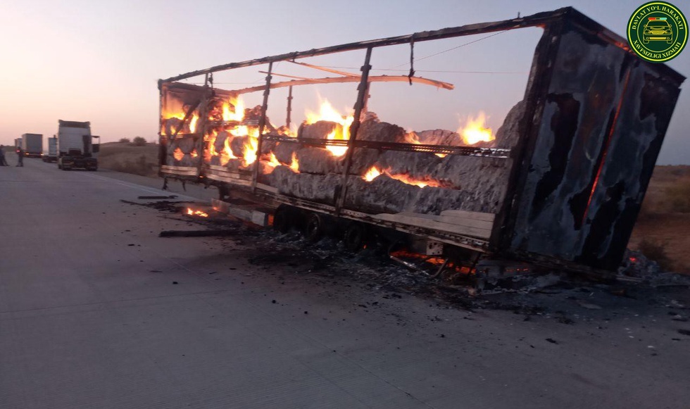 Автомобиль тиркамаси пўлат устунларининг бир-бирига тегиб механик учқун ҳосил қилиши, учқуннинг тез ёнувчи махсулотлар устига тушиши оқибатида ёнғин келиб чиққанлиги тахмин қилиниб, моддий зарар миқдори аниқланмоқда.