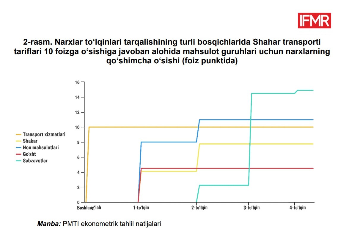 Эконометрик таҳлил натижалари шаҳар транспорт тарифлари эҳтимолий 10 фоизга ошишининг истеъмол нархлари индексига билвосита таъсири унинг тўғридан-тўғри таъсирига нисбатан жуда юқори эканлигини кўрсатади.