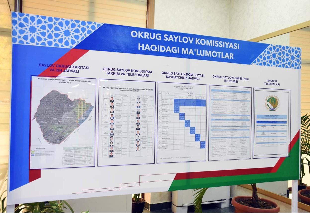 Маълумот ўрнида шуни айтиш лозимки, Президент сайловини ўтказиш учун 14 та сайлов округи ва 10 760 та сайлов участкаси ташкил этилди. Округ сайлов комиссияси аъзолари умумий сони 266 нафар бўлиб, Тошкент шаҳрида 21 нафарни ташкил этади. Участка сайлов комиссиялари аъзоларининг умумий сони 142 044 нафар бўлиб, пойтахтимизда эса 8 889 нафардир.
