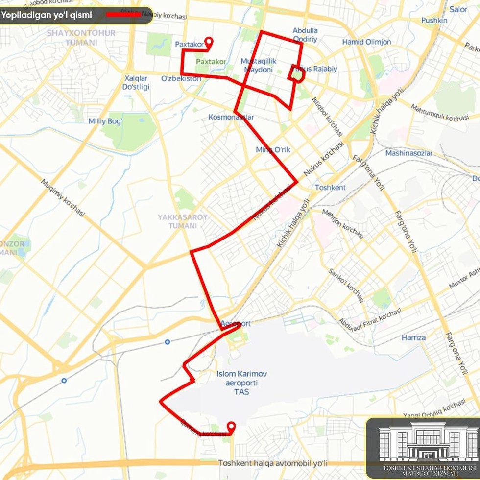 Шу мақсадида 19 август соат 18:00 дан 23:00 гача бўлган вақтда Тошкент халқаро аэрапортидан Қумариқ ва Содиқжон Толипов кўчалари бўйлаб Нукус кўчасигача, Нукус кўчасидан унинг Ойбек кўчаси билан кесишмасигача, Ойбек ва Афросиёб кўчаларидан Афросиёб кўчасининг Шароф Рашидов кўчаси билан кесишмасигача, Шароф Рашидов кўчаси бўйлаб унинг Навоий шоҳ кўчаси билан кесишмасигача, Навоий шоҳ кўчаси бўйлаб унинг Амир Темур шоҳ кўчаси билан кесишмасигача, Амир Темур шоҳ кўчаси бўйлаб унинг Ислом Каримов кўчаси билан кесишмасигача, Ислом Каримов кўчаси бўйлаб унинг Ботир Зокиров кўчаси билан кесишмасигача ҳамда Ботир Зокиров кўчасидан Пахтакор кўчаси 79-уйгача бўлган қисмлари автомобиллар ҳаракати учун ёпилади.