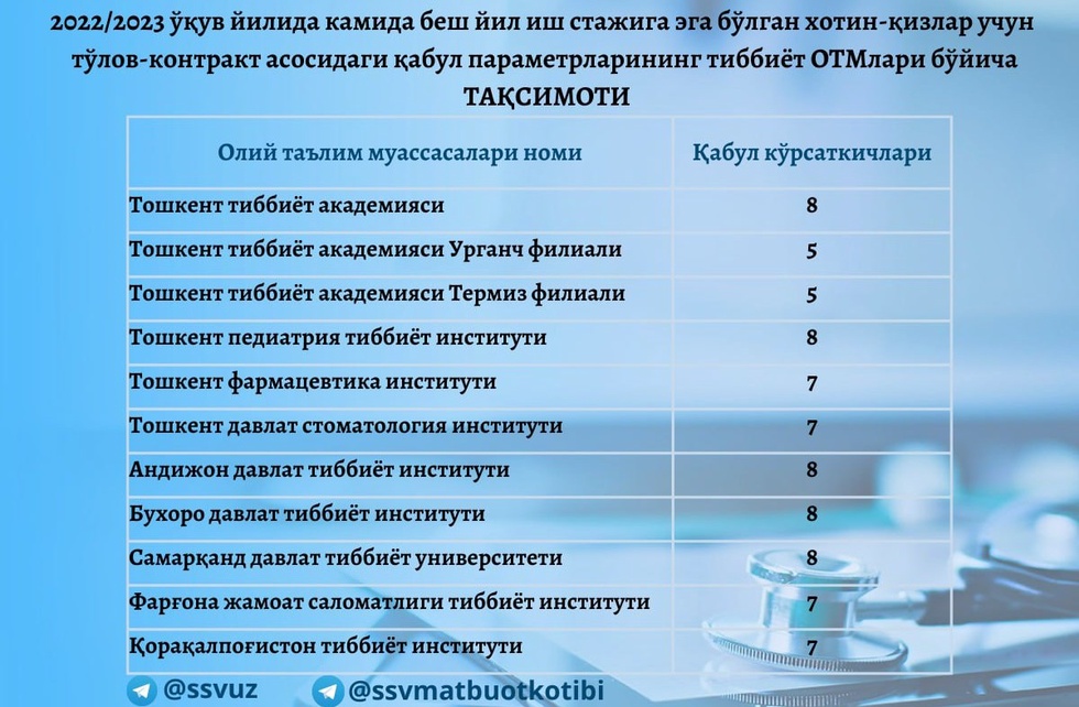 Бундан ташқари, камида беш йил иш стажига эга бўлган хотин-кизлар учун ажратилган тўлов-контракт асосидаги қабул параметрлари бўйича жами барча ОТМлар учун 500 та квота ажратилган бўлиб, улар орасида 11 та тиббиёт олий таълим муассасаси ҳам бор.