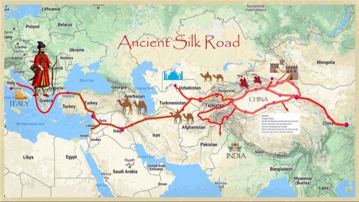 Харитада Узоқ Шарқни Европа билан боғлаган йўл — Буюк Ипак йўли тасвирланган.