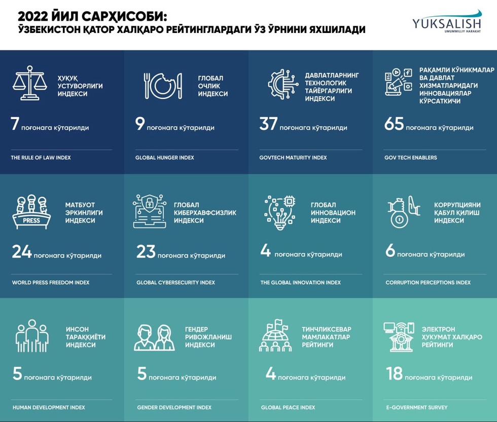 2022 йилда эълон қилинган халқаро рейтингларда Ўзбекистон ўз ўрнини яхшилади. Масалан, GovTech Enablers индексининг рақамли кўникмалар ва давлат хизматларидаги инновациялар кўрсаткичи бўйича дунёда 4-ўринни эгаллаб, ўтган йилга нисбатан 65 поғонага кўтарилди.
