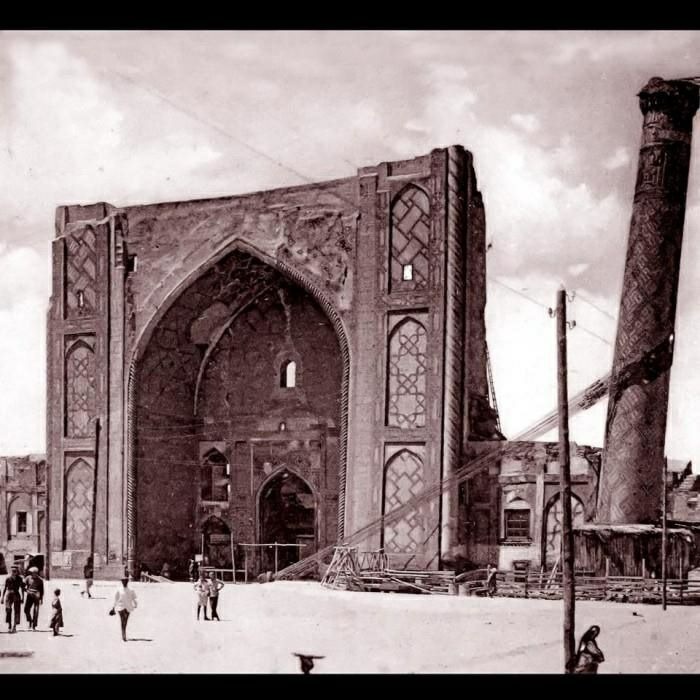 XX аср бошида Самарқанддаги Регистон минораларидан бири (32 метр) ён томонга қийшая бошлаган.