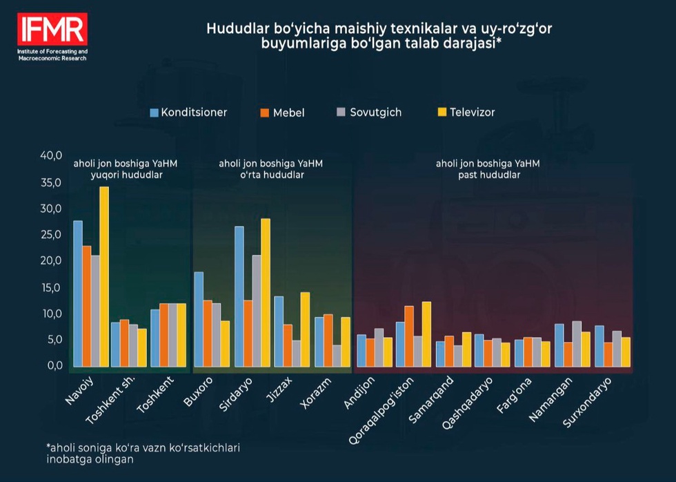 Олинган натижаларга кўра, Навоий, Сирдарё ва Бухоро вилоятларида кондиционер ва мебелга, Сирдарё, Навоий ва Тошкент вилоятларида совутгичга, Навоий, Сирдарё ва Жиззах вилоятларида телевизорга талаб юқори бўлган.