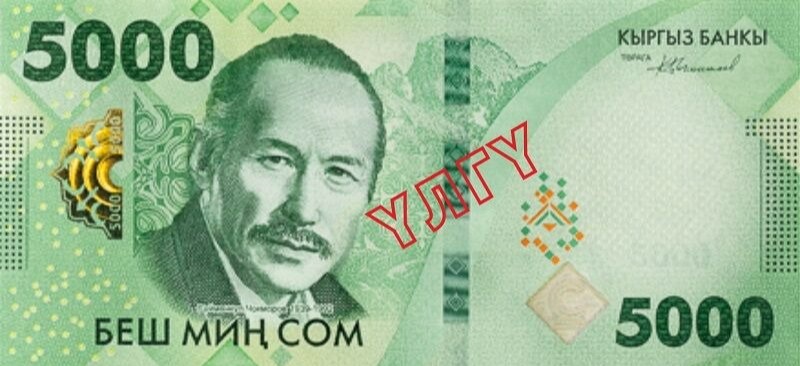 Хабар берилишича, банкнотанинг олд томонида таниқли қирғиз актёри ва рассоми Суйменқул Чўқморовнинг портрети, орқа томонида эса «Ала-Тоо» кинотеатри биноси сақланиб қолган. Банкнотнинг асосий ранги ва ўлчами ҳам ўзгаришсиз қолди.